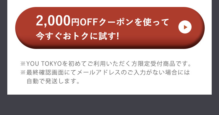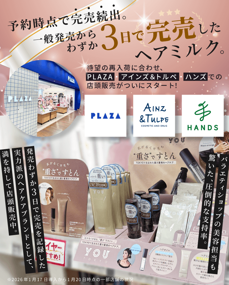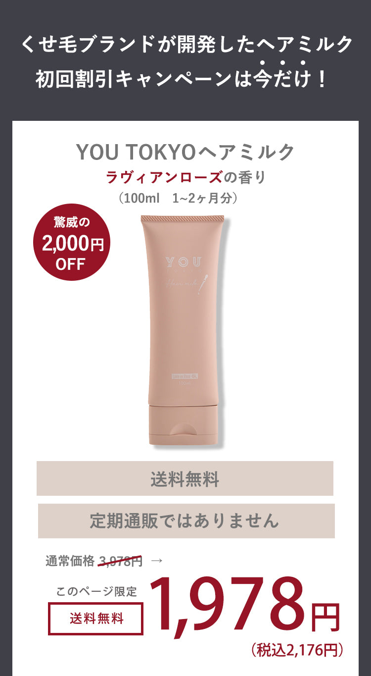 ※YOU TOKYOヘアミルクを初めてご購入の方限定のキャンペーンです。※本商品をご購入いただくには、親権者または法定代理人の同意が必要です。購入をもって、同意を得ているものとみなします。 了承した ※お申し込み前に配送先情報に不備がないか必ずご確認ください。